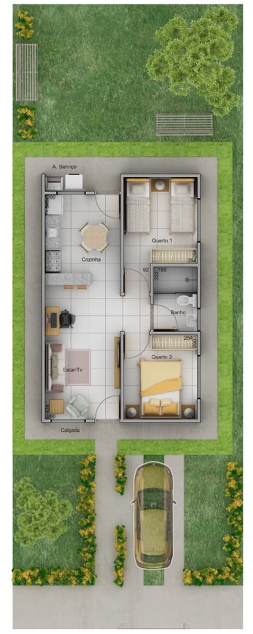 As casas possuem 47 m² em terrenos privativos de 160 m², oferecendo: