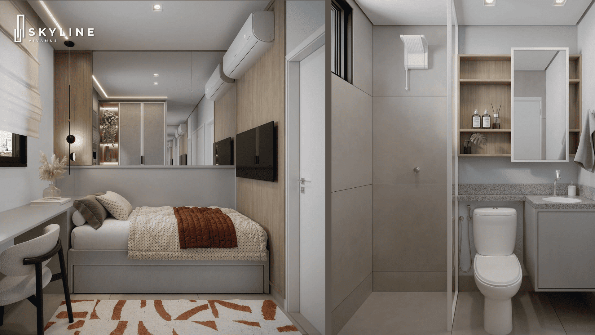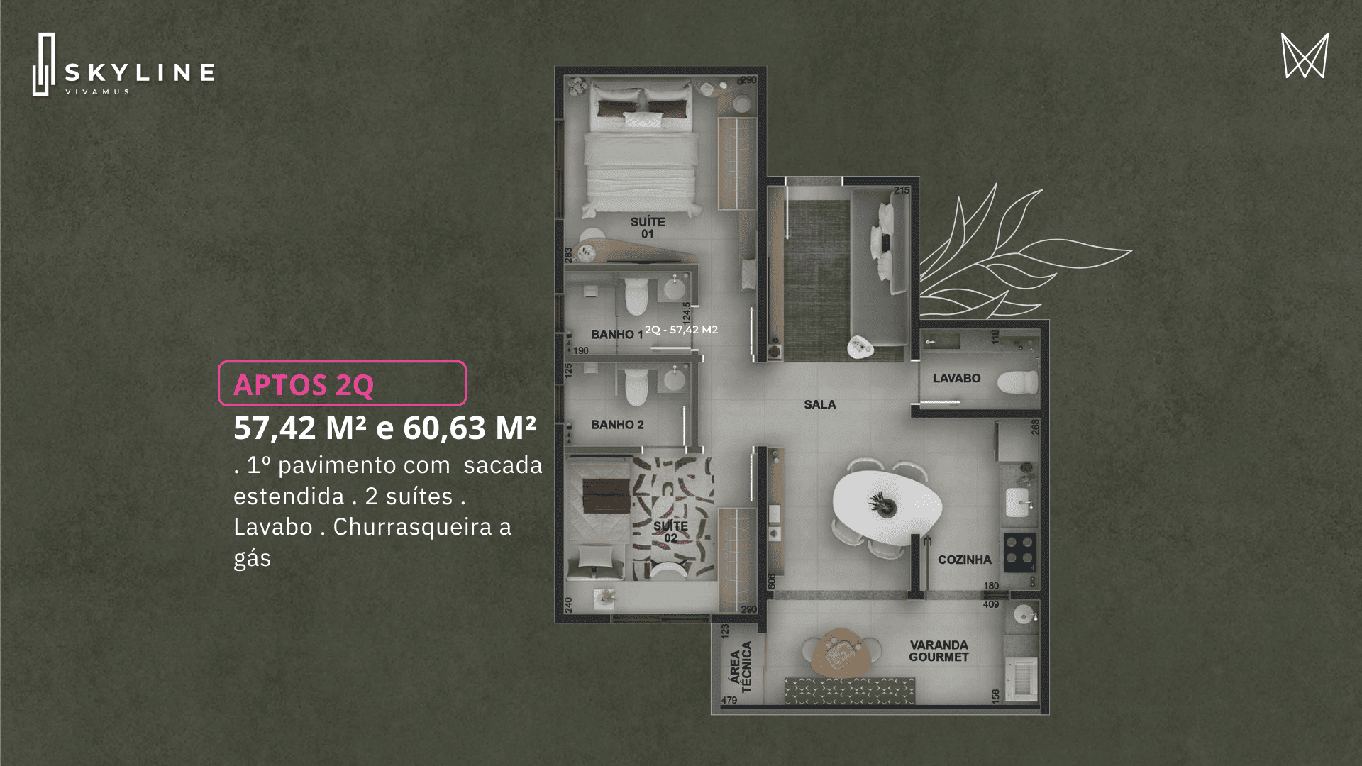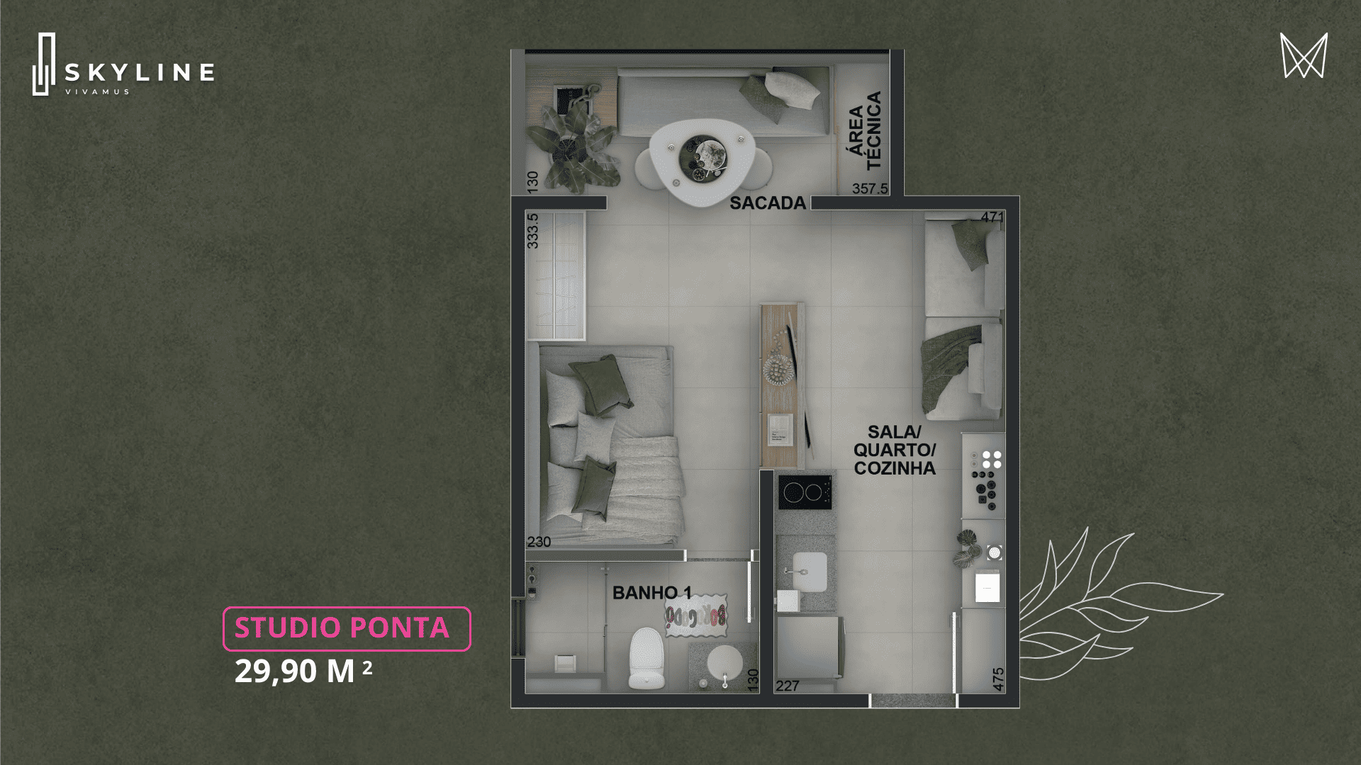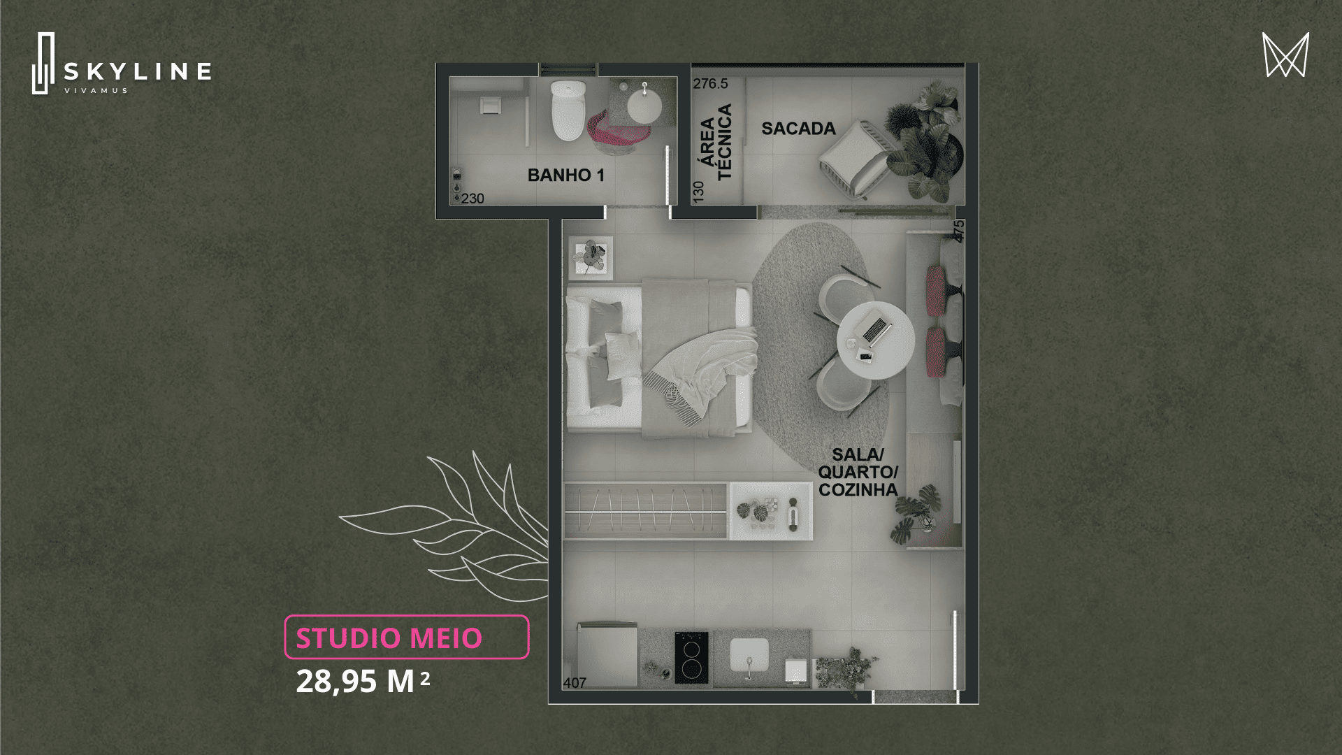 Além dos studios, o Skyline oferece 40 apartamentos de 2 suítes com lavabo, com plantas de: